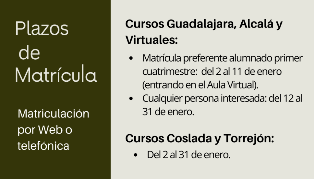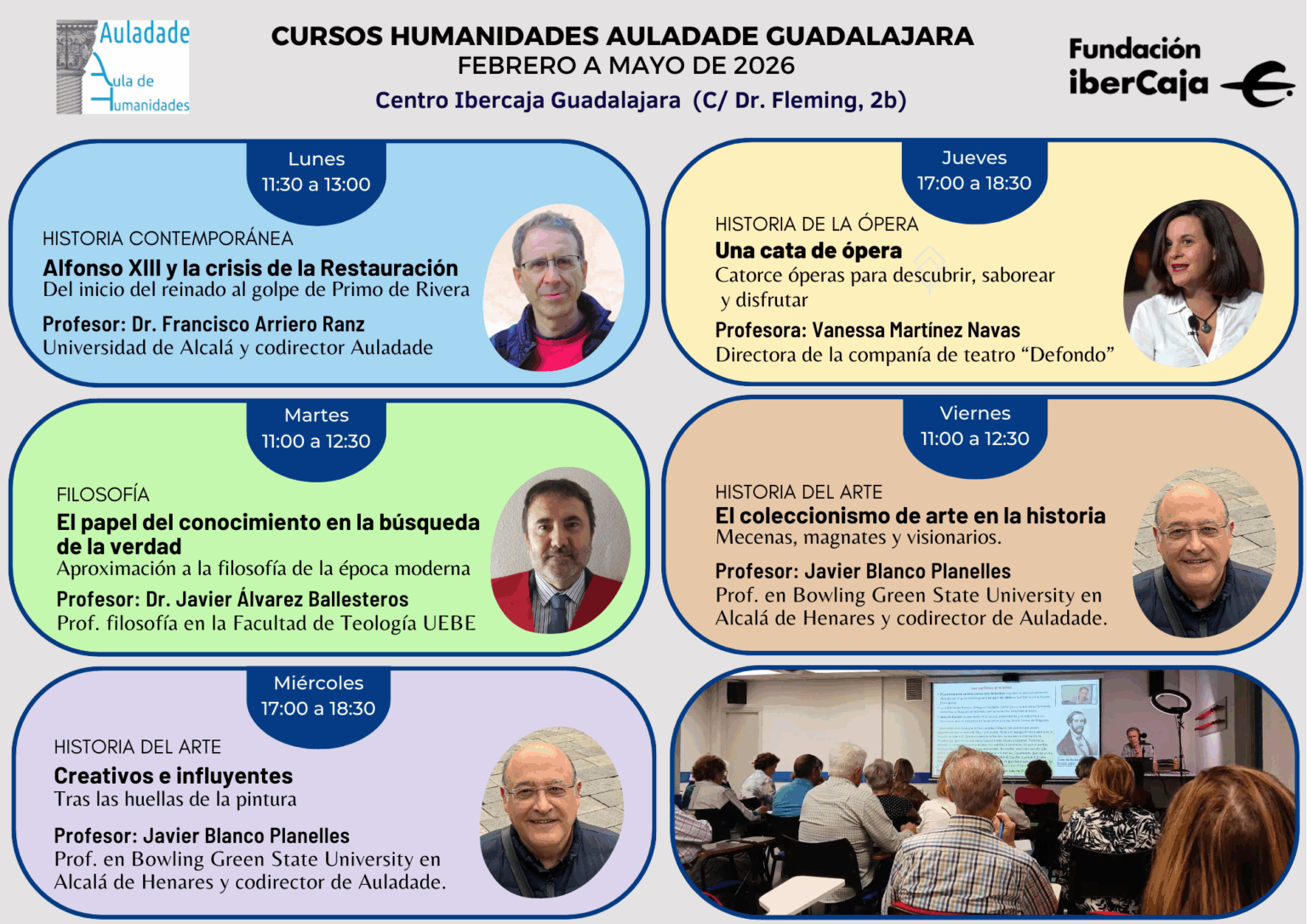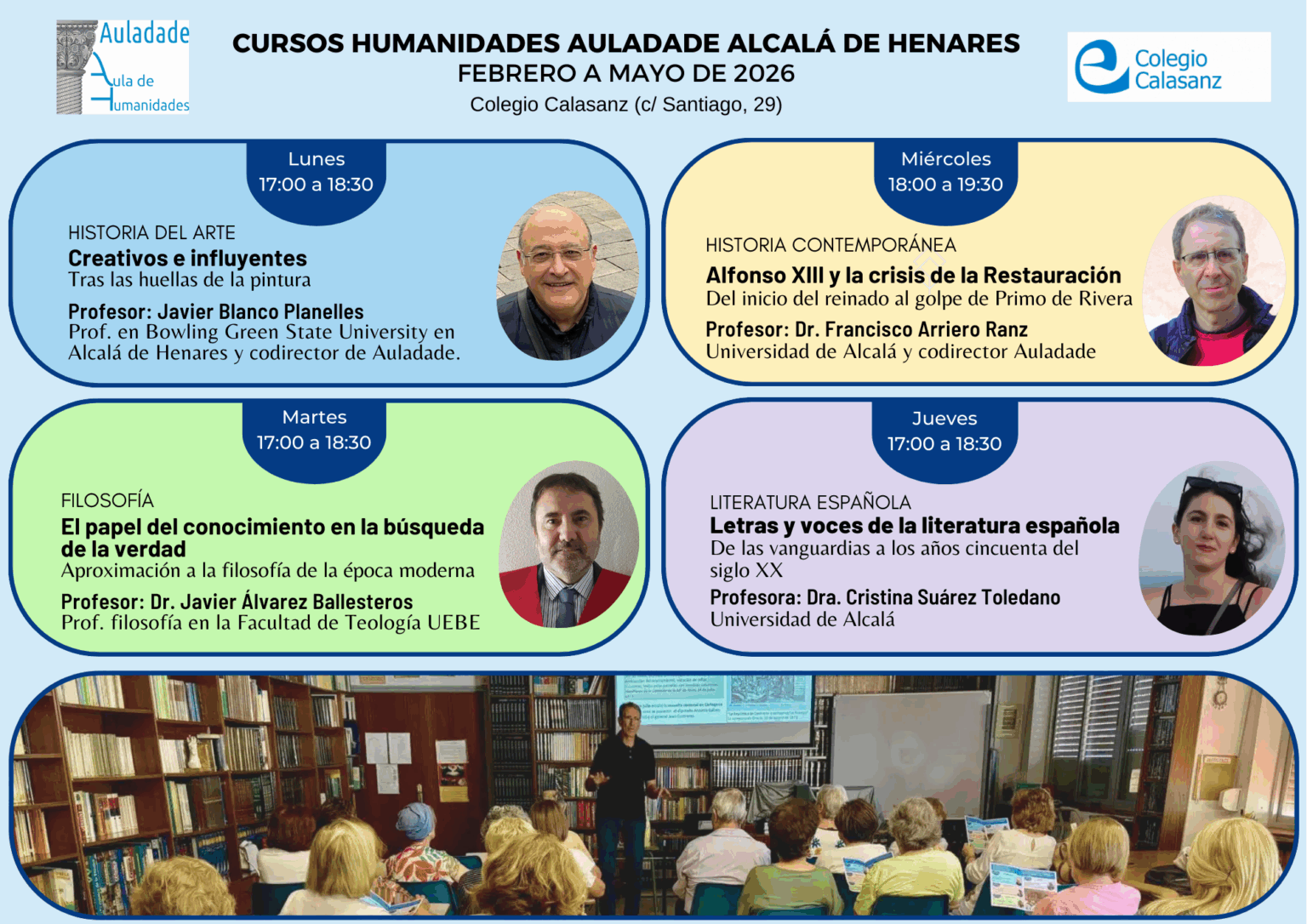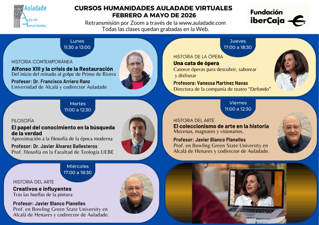 Os ofrecemos la nueva programación de Cursos Auladade para el cuatrimestre febrero- mayo 2026 en nuestras sedes en el Centro Ibercaja Guadalajara, en el Colegio Calasanz de Alcalá de Henares, así como en la modalidad de Cursos Virtuales a través de nuestra web.