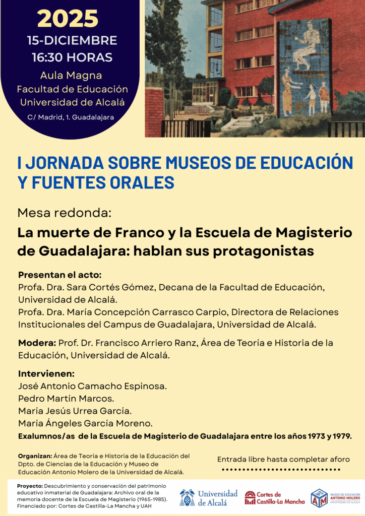 Como adelanto, os informamos que el profesor de Auladade Francisco Arriero Ranz moderará la mesa redonda “La muerte de Franco y la Escuela de Magisterio de Guadalajara: hablan sus protagonistas”. En ella se hablará de los cambios que se estaban experimentando en Guadalajara en los años finales de la dictadura y de cómo vivió esos cambios el estudiantado de la Escuela de Magisterio, a partir del testimonio de quienes estaban en esos momentos en las aulas.