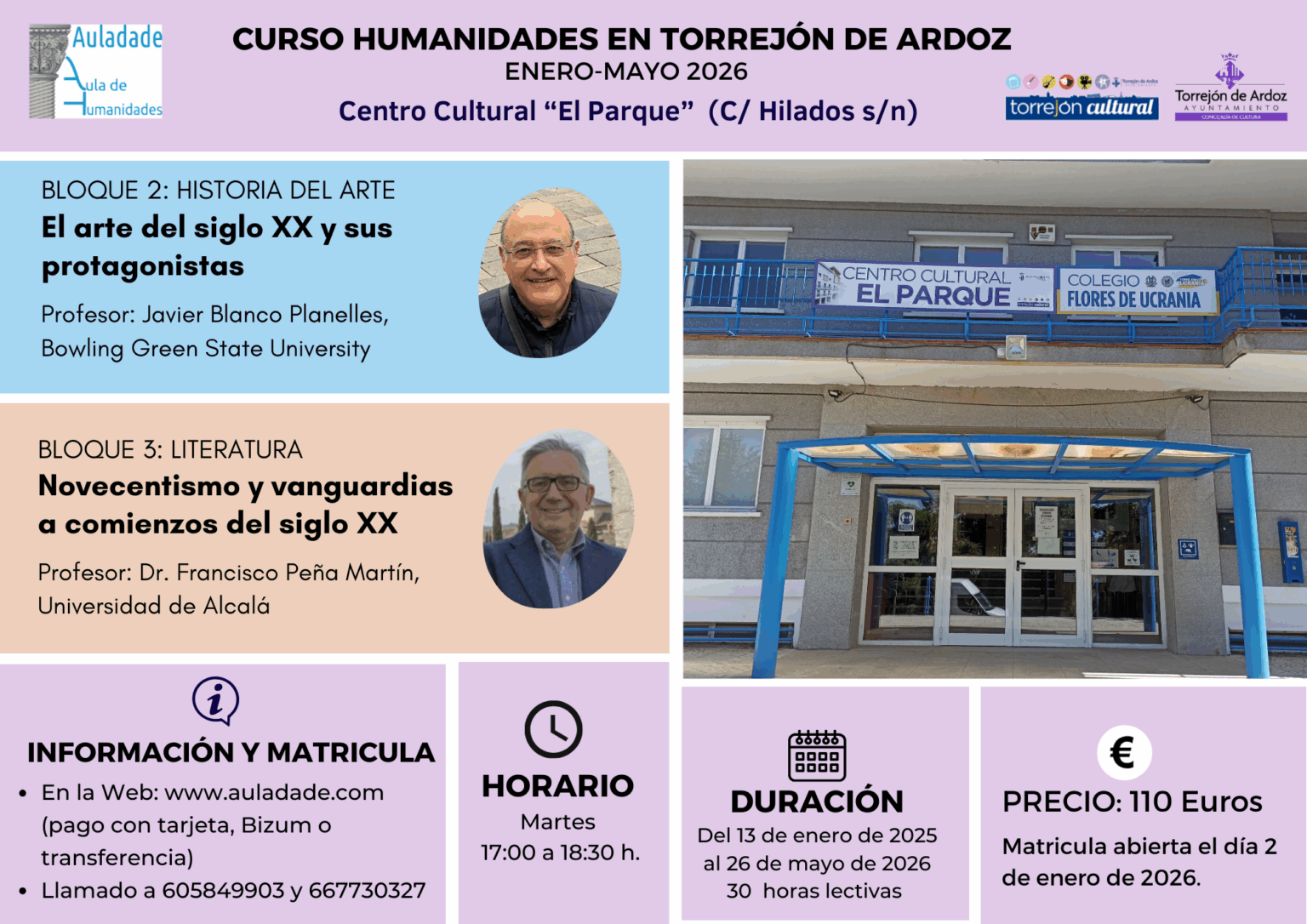 También os presentamos la programación enero-mayo 2026 de los Cursos de Humanidades que impartimos en el Centro Multifuncional “La Rambla” de Coslada y en el Centro Cultural “El Parque” de Torrejón de Ardoz.