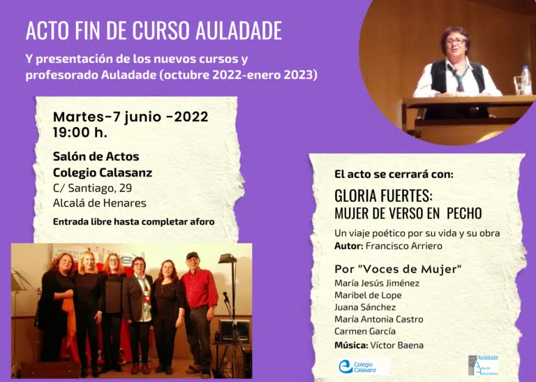 Ese acto en el que participarán los profesores de Auladade se cerrará con un espectáculo teatral titulado “Gloria Fuertes. Mujer de verso en pecho” a cargo del Grupo “Voces de Mujer”.
